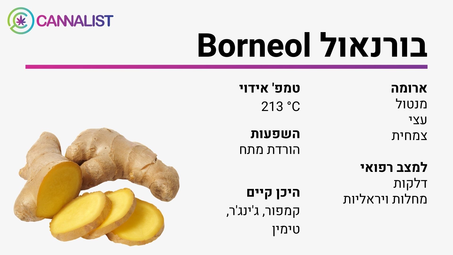 בורנאול (Borneol) הוא הרכיב העיקרי בשמן הקמפור הריחני המשמש כחומר גלם מעולה להפקת חומרי הדברה ותרופות. לבורנאול תפקיד חשוב בשיטות טיפול אסייתיות רבות בזכות אפקט משכך כאבים, נוגד קרישה ואנטי דלקתי. יש לו ריח עצי חריף עם נוכחות צמחית רעננה המזכירה מנטול. בורנאול די נפוץ בבגנטיקות קנאביס מפורסמות, אך ניתן למוצאו גם בג׳ינג׳ר, טימין, רוזמרין, מרווה ובעץ הקמפור. למעשה, בעבר הוא היה מופק ישירות מהשרף בגזעים שלהם, אך כיום קיימות גם גרסאות סינתטיות זהות המזוקקות מטרפנטין.