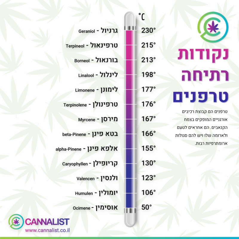 מרבית הטרפנים מתאדים בטמפרטורות נמוכות יותר מאשר קנבינואידים ואילו בטמפרטורות גבוהות הם מתכלים ופחות מורגשים. להבדיל מ-THC ו-CBD, ככל שהטמפרטורה גבוהה יותר כך יותר חומר פעיל יגיע למצב נדיף ולכן ההשפעה הפסיכואקטיבית תהיה חזקה יותר.