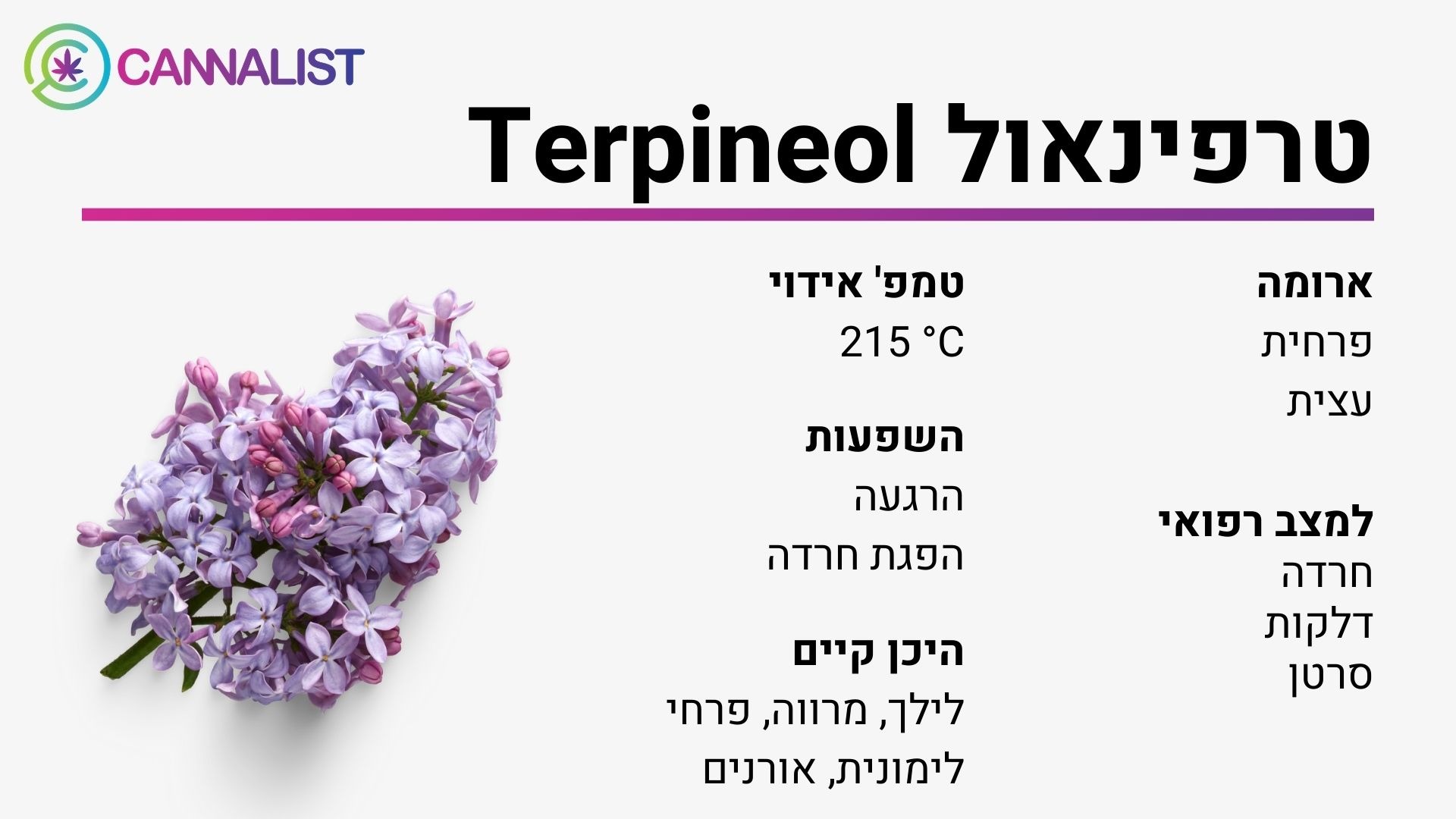 טרפינאול (Terpineol) הוא טרפן הנפוץ ביותר ממאה וחמישים זני צמחים בטבע, ביניהם בפריחות הלילך והליים, בשרף האקליפטוס ובעצי ברוש. טרפינאול מפיק ארומה פרחונית-הדרית עדינה והוא מחזיק פוטנציאל רפואי למגוון סיבוכים רפואיים. למרבה המזל, טרפינאול גם נפוץ בלא מעט זני קנאביס, בעיקר באלו בהם נפוץ גם פינן.