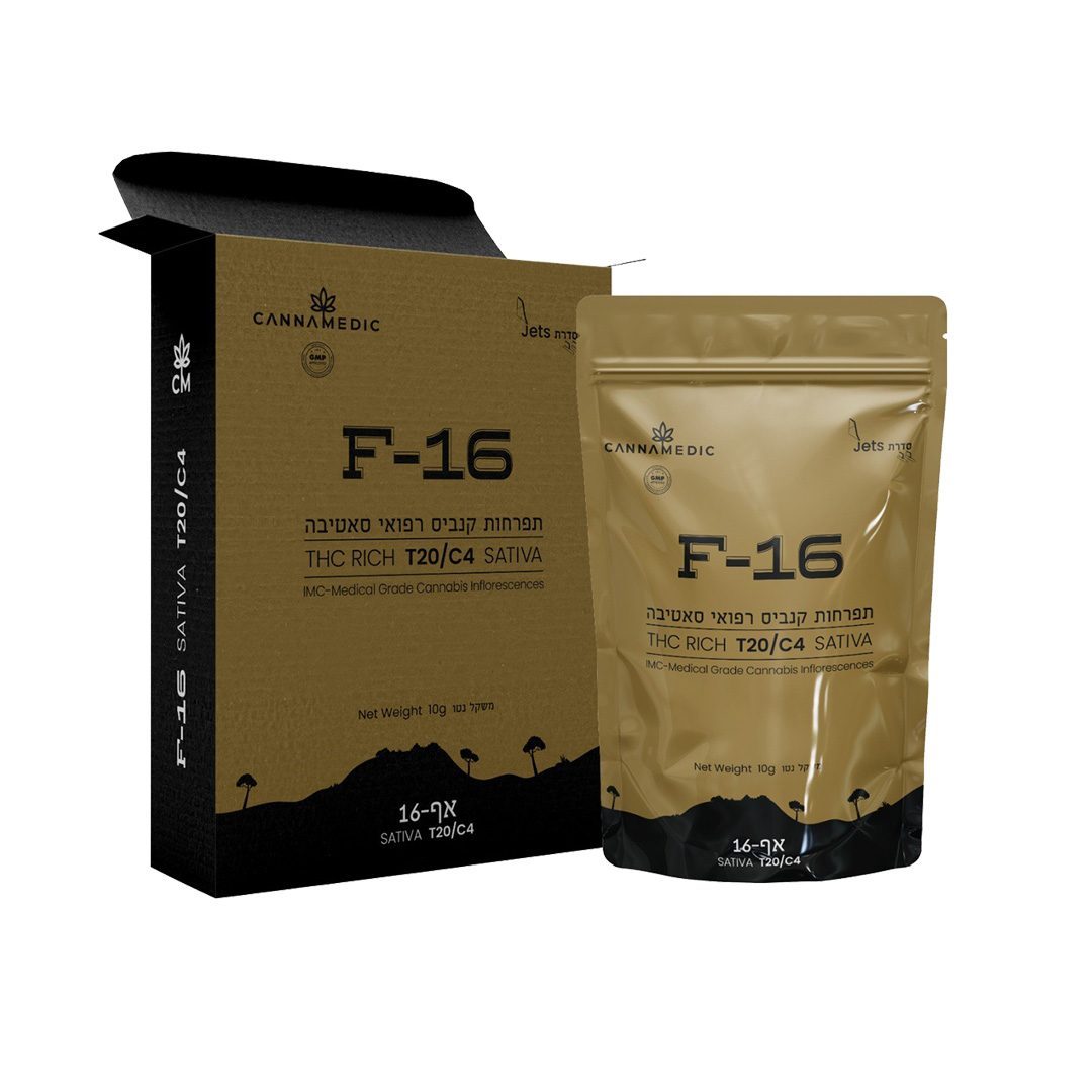 אף 16 (F-16) הוא זן סאטיבה מסדרת ג'טס – Jets מבית קאנמדיק (CannaMedic) במינון T20/C4. מתאים לשימוש יום.