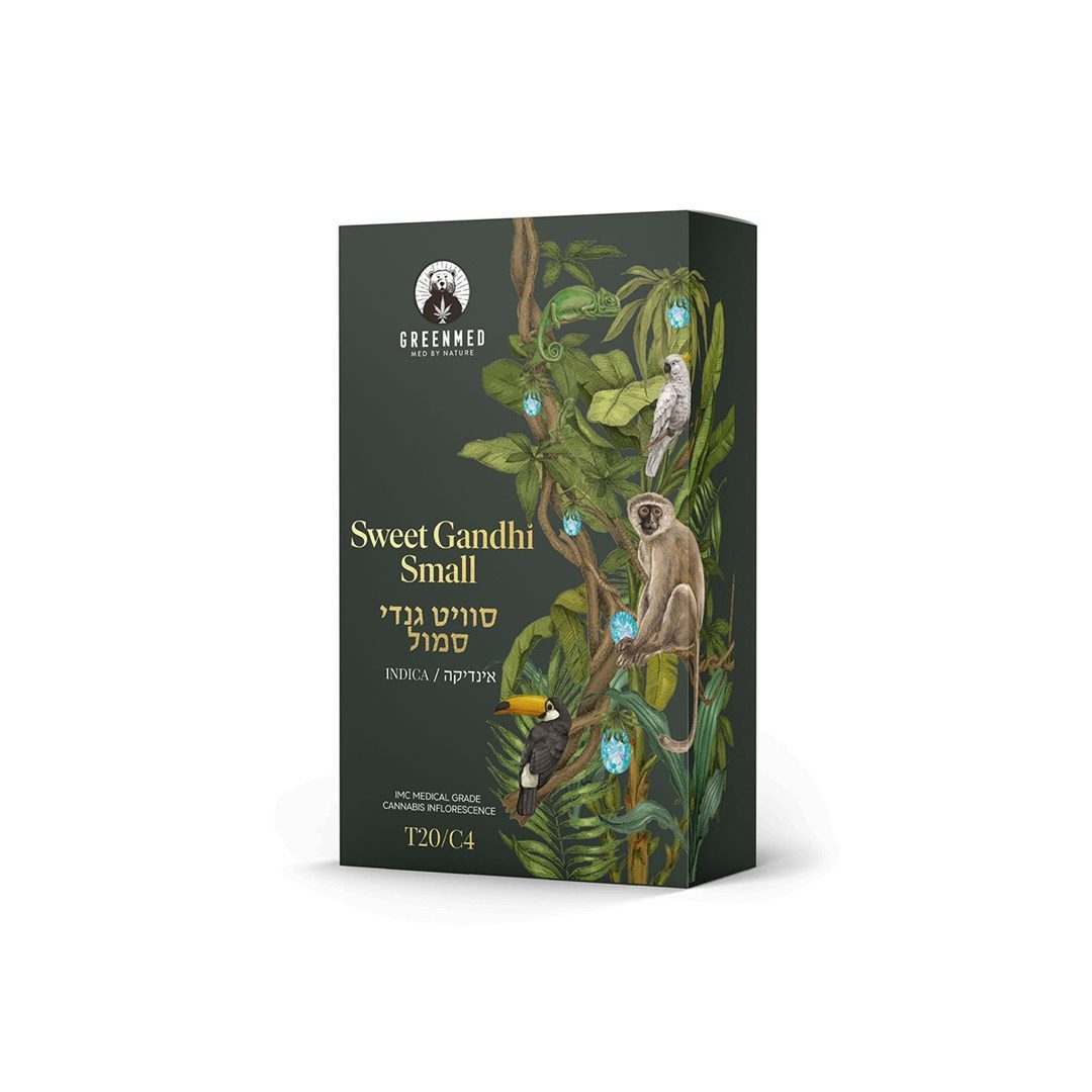 תפרחות קנאביס רפואי סוויט גנדי סמול אינדיקה במינון T20C4 מבית גרין מד. בסדרת סמול (small) התפרחות הקטנות מופרדות מהגדולות באמצעות מיון ידני ולאחר גיזום ידני ויישון הן נמכרות במחיר מוזל. הוא בעל טעמים טרופיים וארומה מתקתקה של מנגו ואננס.