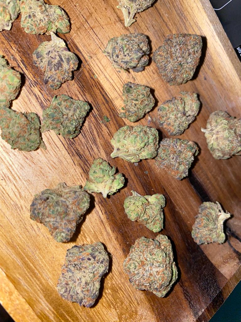 גודל התפרחת ונראותה: 3 פרחים בודדים במשקל 1.0-1.3 , וכל השאר באצונים של 0.5 , פרחים אחידים , טריכומות מפוצצות וחזקות , פרחים יציבים מאוד וטריים! , טרימינג אש , רוב התפרחת בצבע סגול חזק ויפה , ירוק בהיר שגובל בכהה ונוצץ , שיערות בצבע דבש דומיננטי.