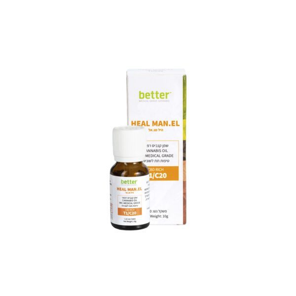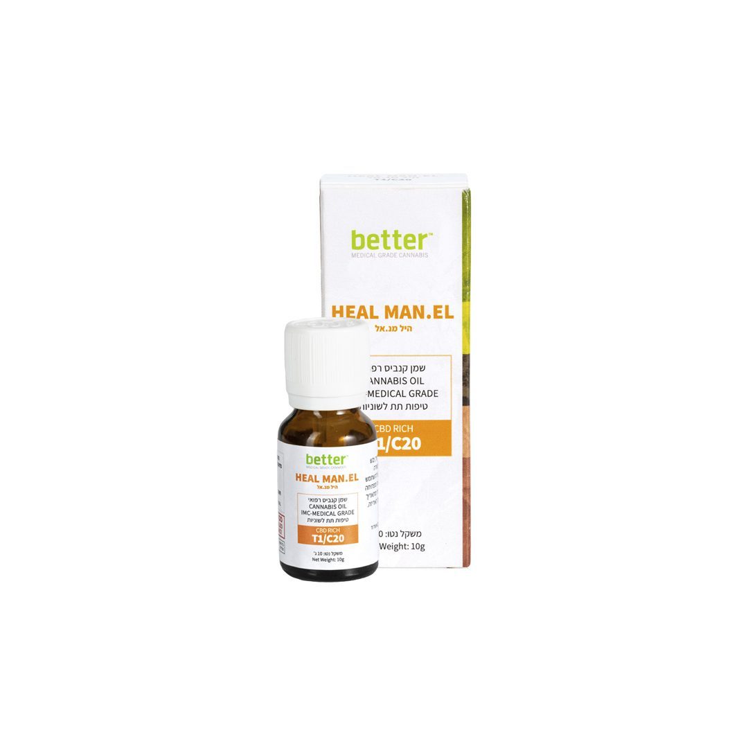 שמן היל מנ.אל Heal Man.EL היברידי במינון T1/C20 מבית חברת בטר. זן עתיר CBD ומיועד לשימוש יום/לילה.