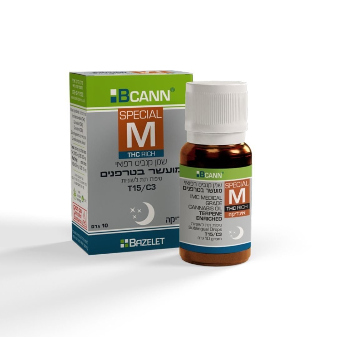 שמן קנאביס רפואי ספיישל Special M מבית חברת BCANN (בזלת פארמה). שמן אינדיקה עתיר THC במינון T15/C3 המועשר בטרפנים. מיועד לשימוש לילה.