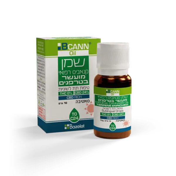 שמן קנאביס רפואי BCANN מבית חברת בזלת. שמן קנאביס עתיר CBD במינון T0/C24 המועשר בטרפנים. מיועד לשימוש יום.