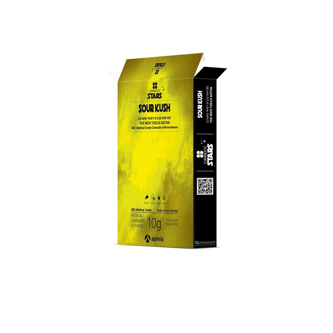 תפרחות קנאביס סאוור קוש – Sour Kush ביבוא מבית חברת אפריה – Aphria הקנדית. סאוור קוש הוא זן סאטיבה עתיר THC בסדרת סטארס (Stars) של חברת קנדוק.