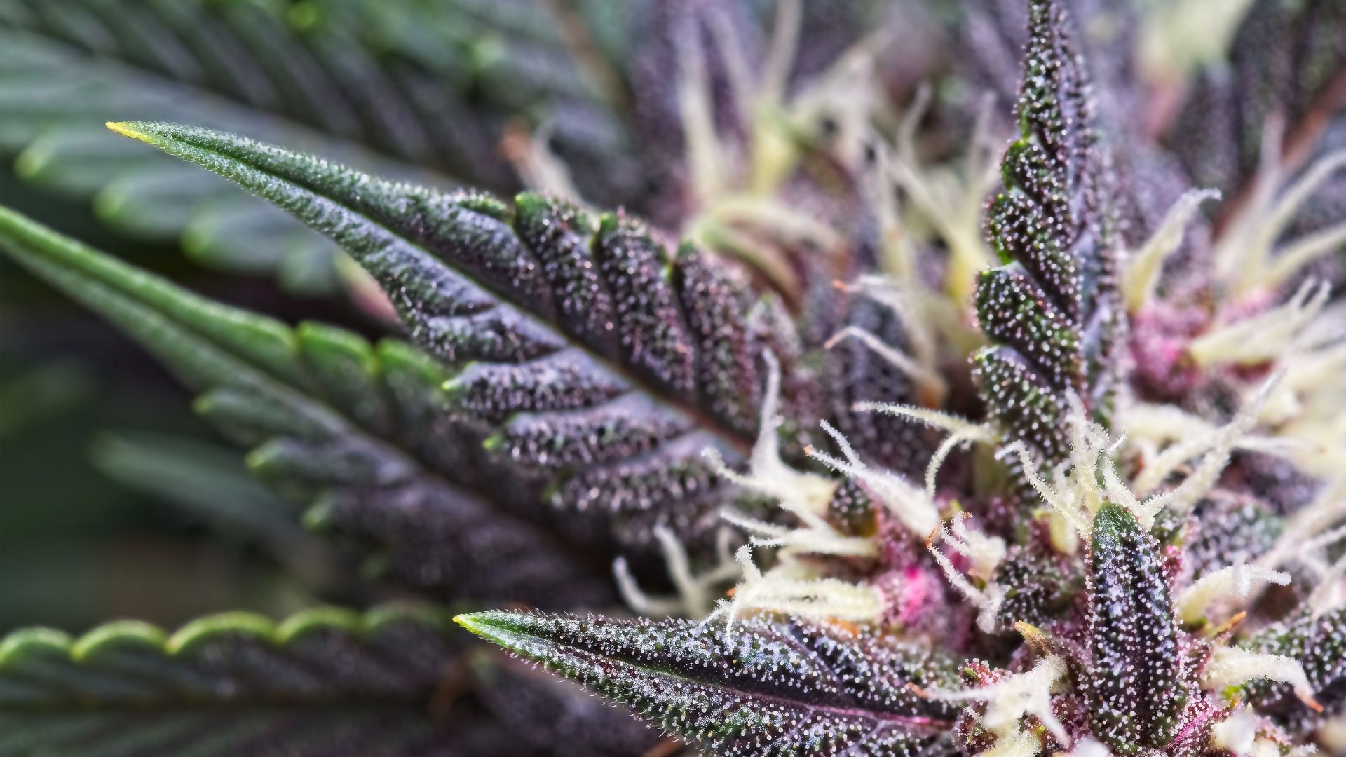 גנטיקות קנאביס מסוימות מתהדרות בעלווה בגוונים של סגול, אדום כהה או כחול עמוק. התפרחת יכולה להישאר ירוקה לחלוטין בעוד העלים צוברים כתמי סגול שאט אט עוטפים אותם לגמרי.